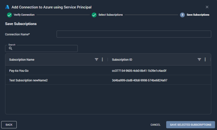 - Once the account is verified, all subscriptions that are associated with the account or Application ID are listed. Select the subscriptions that you want to include in this connection.