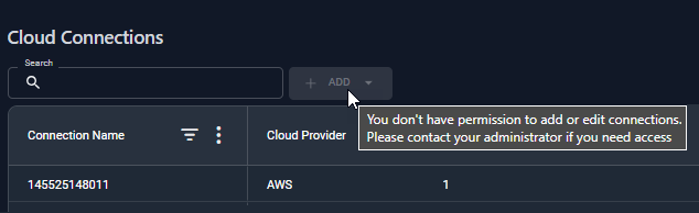 When working with cloud connections, all users can access and view the cloud connections page. Only a user assigned to the “SaaS_Audit_Admin” group can create public cloud connections. See Managing Densify User Accounts for details on adding the role to your user account.