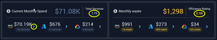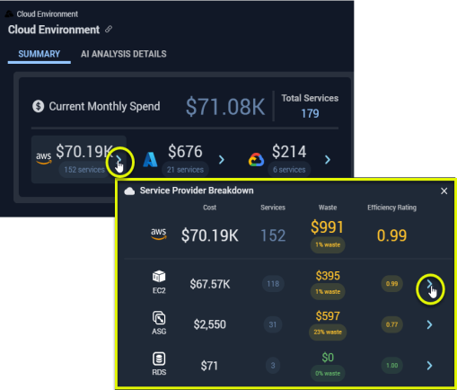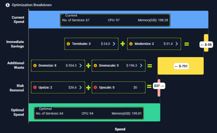 The current and recommended estimated instance costs are used to calculate potential savings or additional spend. Calculated as: (current estimated cost - recommended estimated cost).- The total estimated Monthly Waste is the sum of the selected instances with positive savings values.