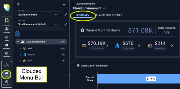 - A link to open a modal view showing a breakdown of spending on each service type and possible savings.