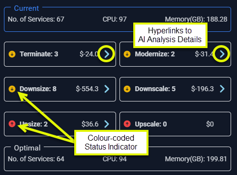 These cards list the aggregated recommendations for the selected scope of systems, broken down by the same optimization opportunities listed above. These cards provide the details of the recommendations that comprise the total in the corresponding bar chart. The values are colour-coded to easily identify wasted resources and systems at risk. Links to the AI Analysis Details page, with the appropriate view applied, are provided so you can investigate the recommendation.