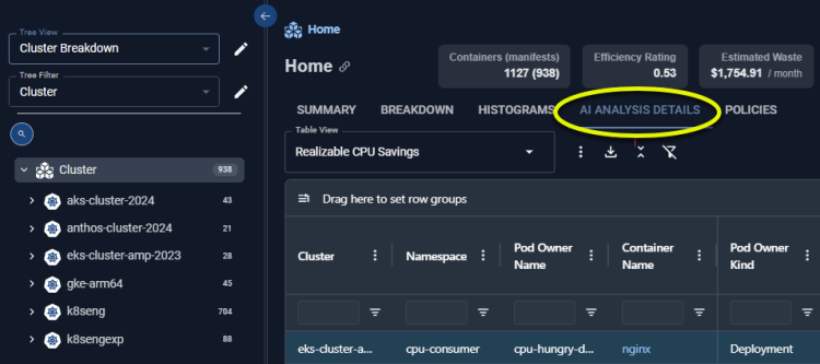 - A tabular report—A configurable tabular report is shown in the top pane. Descriptions of each column are provided in AI Analysis Details Table tabular data