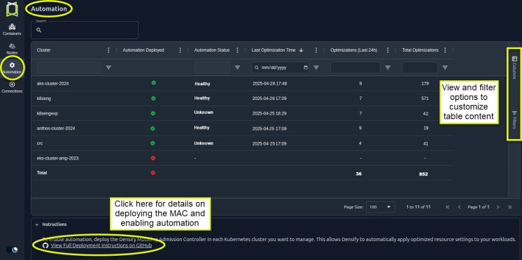 Automation Deployed | The red or green icons indicate whether or not the Mutating Admission Controller has been deployed. If a container within the cluster called “densify-webhook”, then the status is Deployed (green icon), otherwise the status is Not deployed (red icon). |
