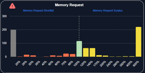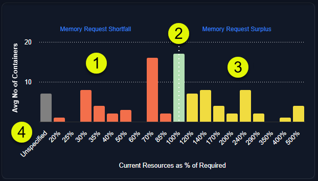 - Containers with surplus resources are identified as having over 100% of their optimal allocation (Current Resources as a percentage of required >100%). These containers are shown on the right side of the chart and highlight stranded resources that are committed to pods that are not using them.