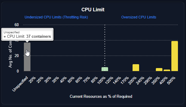 ![]() | Unspecified—You can indicate whether or not to include containers with unspecified values.When enabled, the grey bar indicates the number of containers with unspecified values. If, for example, both the CPU Request and Limit values are unspecified for a container manifest, this will contribute to the unspecified count in both the CPU Request and CPU Limit charts. If only the CPU Limit value is unspecified then only the unspecified count on the CPU Limit chart is incremented. |