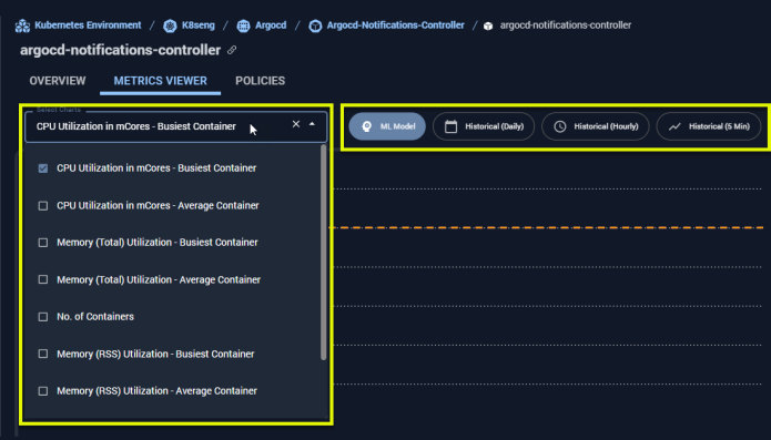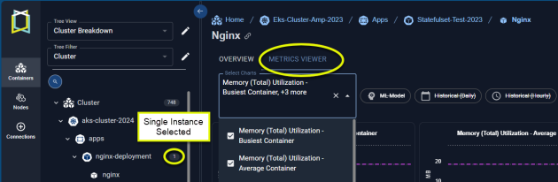 When you open the metrics viewer, the instance that was selected in the Instance Optimization Details page is displayed. You can from the tree viewer, or from the AI Analysis Details tab. You can configure the data you want to view for this container using the options in the dropdown menus.