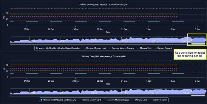 - CPU and memory request and limit values are shown as straight lines.