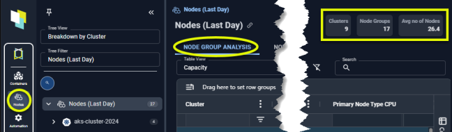 - Capacity—The columns have been selected to show you how effectively your node group resources are being used.