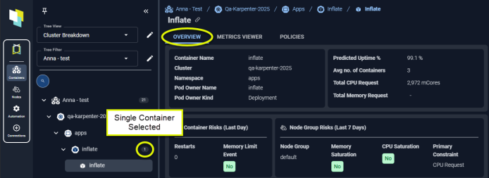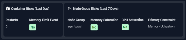 These 2 cards summarize potential resource risks for the container and node group, on which the containers are running.