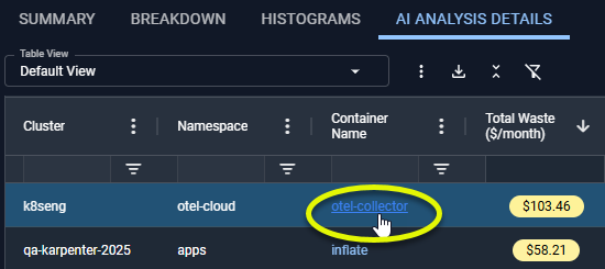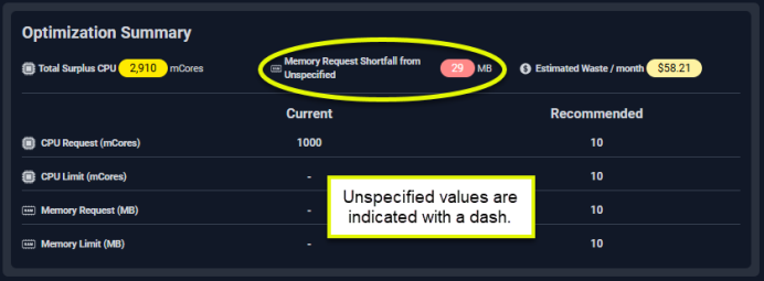If the selected manifest does not have CPU or memory request values set, additional cards with details of the impact of unspecified values are shown. See Containers with Unspecified Settings for more details.