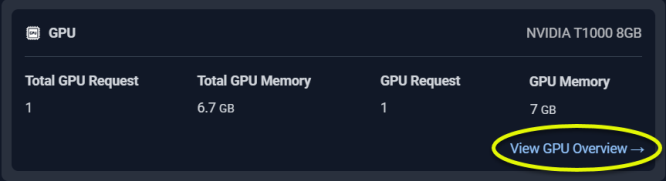 This card summarizes the GPU allocation and for the selected container. This card is only displayed if the GPU resources have been allocated to this container. A hyperlink at the bottom of the card takes you to the GPU page.