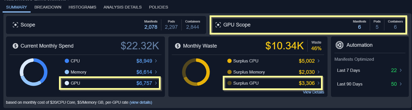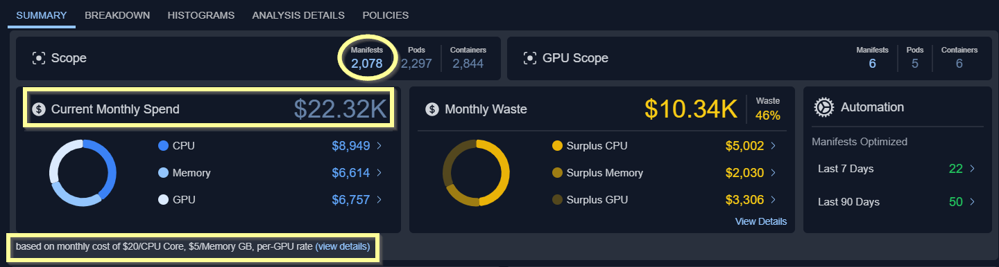 This first chart summarizes your current spend and breaks down CPU, Memory & GPU spend. A hyperlinked value of “manifests”takes you to the Analysis Details tab with same scope of systems selected.