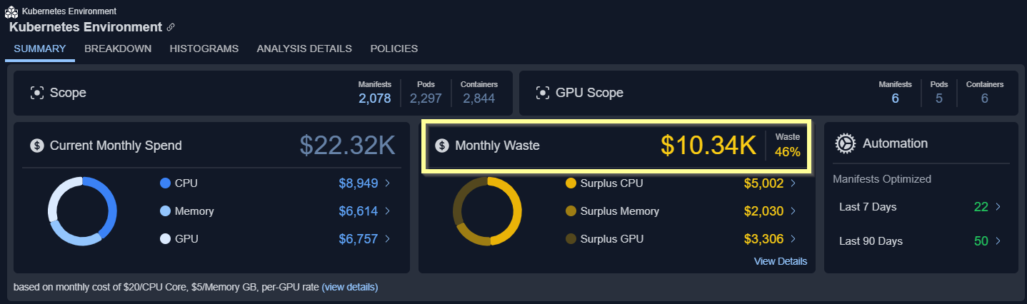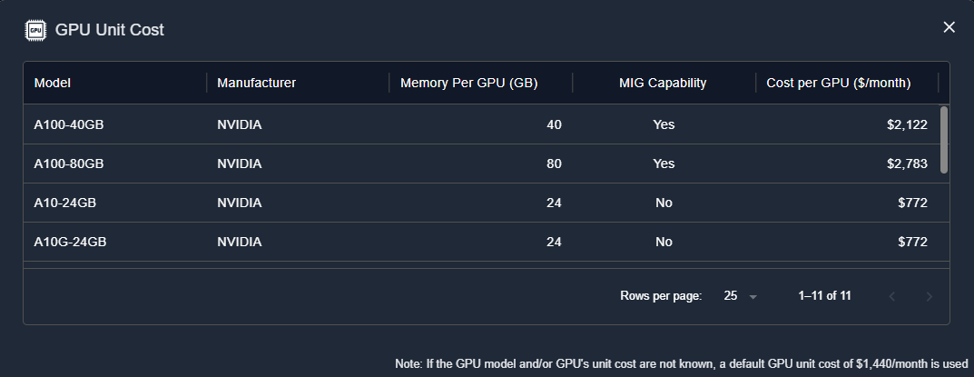 The default unit monthly cost of a vCPU, a GB of Memory, and GPUs are shown here. These values are used for all cost calculations. The values are configurable.Monthly Waste