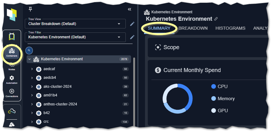 This block shows you wasted resources as a dollar amount broken down by CPU and memory requests. These histogram charts show your data grouped as a distribution. The scope of data, is defined by the tree viewer. The link on the right side of each chart takes you to the histogram page, with same scope of systems selected.