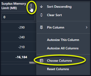 You can configure the table to display only the columns of interest.- Access the column selection dialog box, from each column’s context menu or from the icon on the right side of the page.