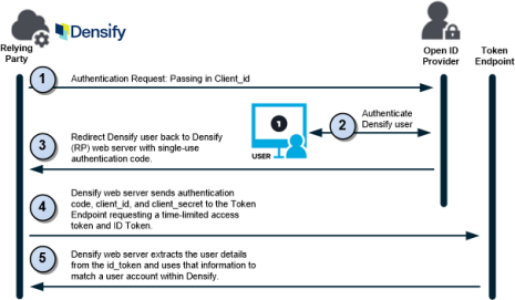 When this option is enabled, rather than transmit the user details, the identity provider sends a special, one-time-use authentication code that can be exchanged for an access token. This exchange includes the client_id and client_secret in addition to the authentication code. The Densify user, attempting to access Densify is still redirected to their identity provider’s login screen where they enter their credentials. The user must be registered with the identity provider and must have valid credentials to access Densify. Upon successful login, Densify validates the user using the ID token returned by the identity provider, as defined by the OpenID Connect specification. Additionally, the identity provider returns an authorization code to the browser. The Densify web server now uses the supplied authorization code to request an access token. The identity provider validates the authorization code and sends the access token. Validation is completed by Densify when a user profile with an email address that matches the user’s email address is located in the Densify database.Figure: Authentication Code Workflow