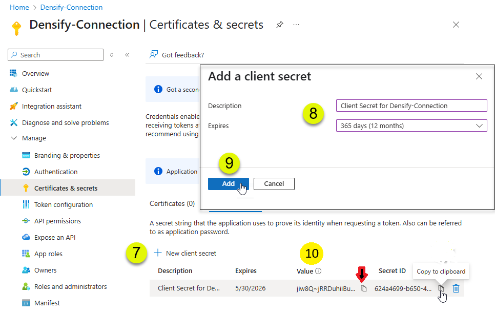 - In the Add a new client secret pane, enter a Description (e.g. DensifyKey) and an expiration period (e.g. 1 year, 2 years or never expires).