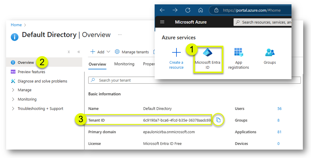 The tenant ID corresponds to the Microsoft Entra ID.- Login into your Azure account and click on Microsoft Entra ID> Overview .