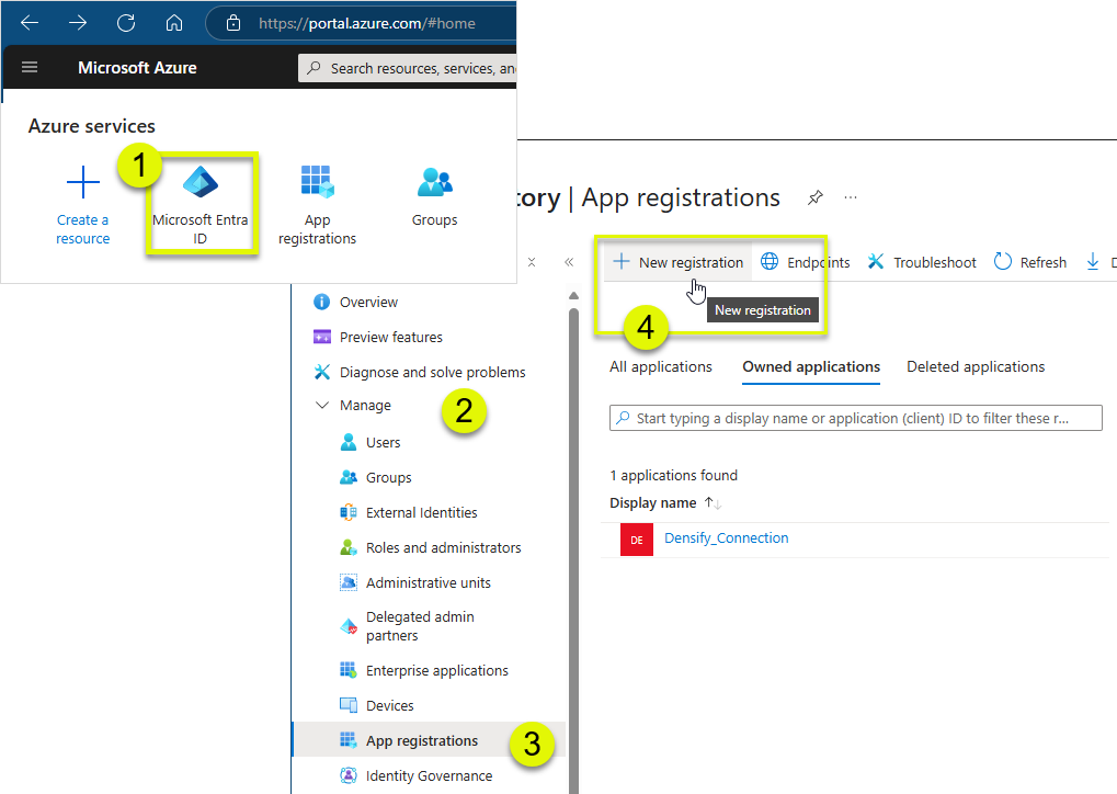 You now need to create a new application registration. This will be the service principal for Densi. You will need the Application ID and corresponding client secret (key), to complete the Densify connection.- Click App Registration.