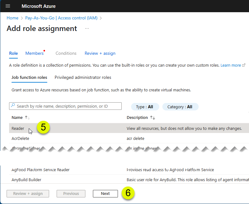 - In the Add role assignment pane select the Role of “Reader”.