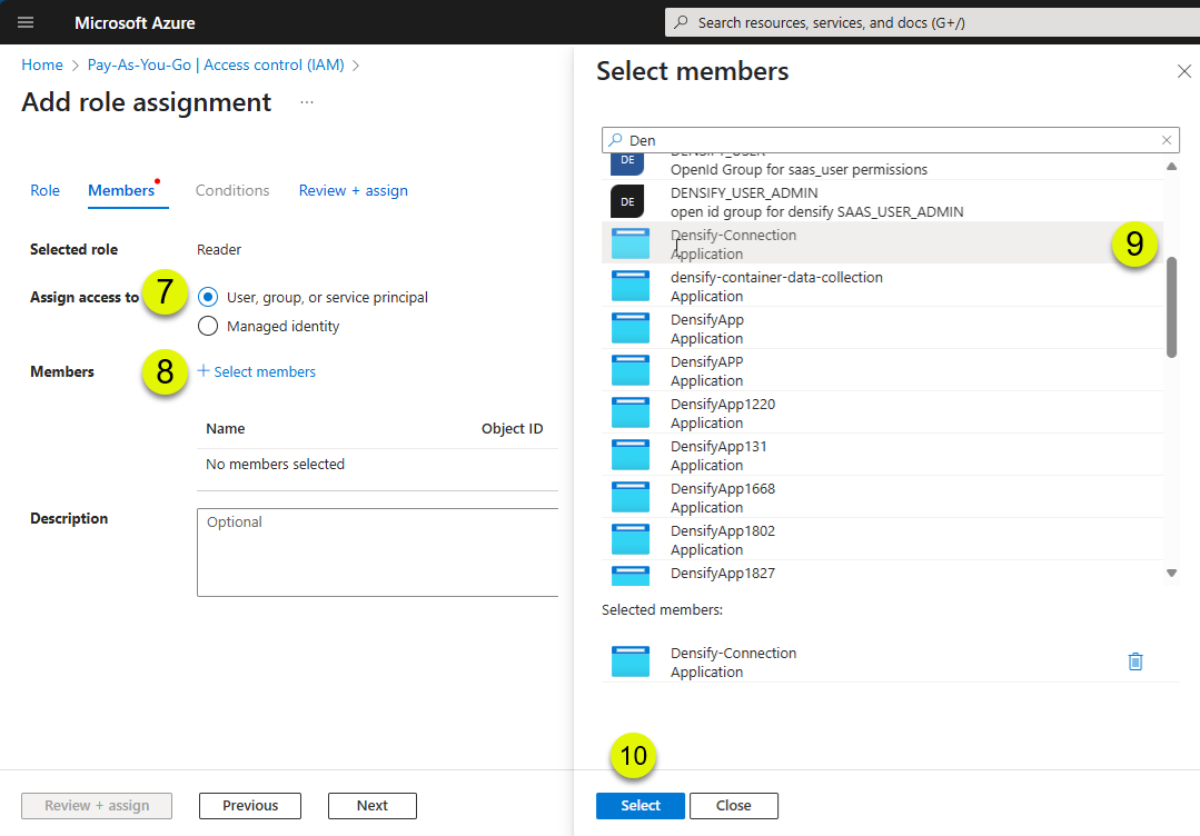 - Search for or scroll to locate the service principle (Densify_Connection), created above.