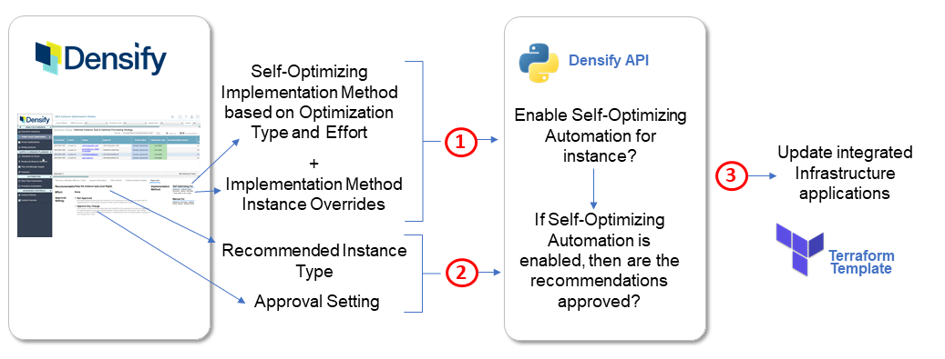 - The instance optimization, instance approval and self-optimizing details can be retrieved by the Densify API for manual or automation purposes, such as updating Terraform templates for instance optimization automation.