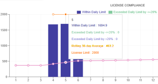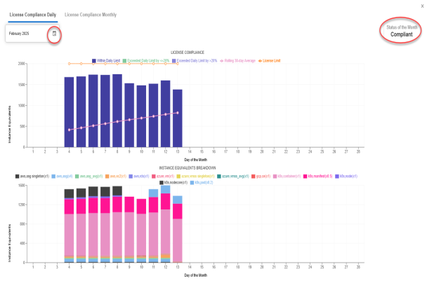 - The License Compliance Daily tab is selected by default. You will see your current compliance data for the current month. Click the calendar icon to review historical data.