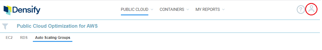 To review these reports:- In the Densify Console click the User icon in the top right corner of the page.