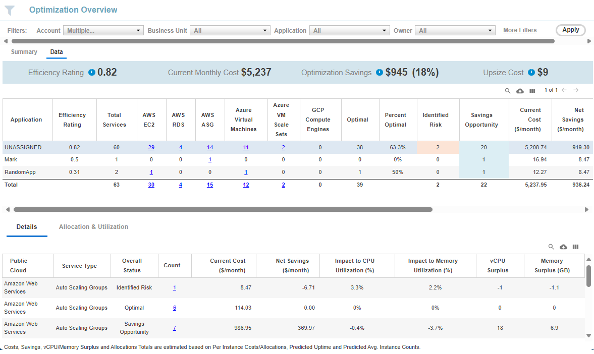 The breakdown of the data for your aggregated cloud environment is displayed on this tab. You can control how the data is displayed in this table using the Group By feature. The Group By setting is used in the first column and data is retrieved and displayed accordingly. For example, if you wanted to group the data based on Business Unit, Densify displays the analyzed data sorted based on the value of the Business Unit resouce tag. See Using the Group By Feature. The top table provides a breakdown as follows: Table: Optimization Overview - Data Tab ColumnsColumn(s) | Description |