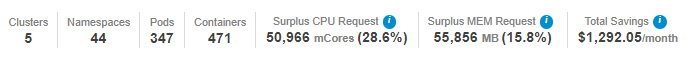 Summary totals are displayed in the upper right corner of the page. These totals are for the systems displayed on the current page and not all analyzed containers. The information icon, on the Surplus CPU Request/Surplus Memory Request and Net Savings values indicates that these values do not include containers with requests set to “Unspecified”. See Optimizing Your Containers.Figure: Running Total Summary