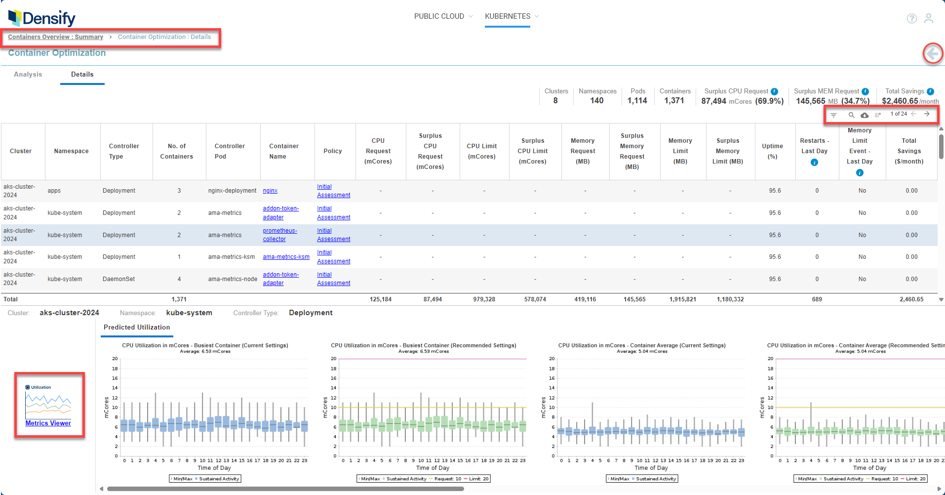 Clicking on any row in the tabular report, in the upper pane, shows predicted utilization details in the Predicted Utilization Metrics tab, in the lower pane.- Metrics Viewer—The link on the left side of the lower pane, opens the metrics viewer. You can use the metrics viewer to investigate details when deciding whether to action specific recommendations. See Using the Metrics Viewer for Containers.