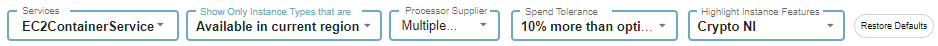 Spend Tolerance | 5x more than optimal | Specify a spend tolerance value that determines cost compatibility. For example, selecting a value of 20% means that instance types that cost up to 20% more than the optimal instance type are considered compatible. You can choose a spend tolerance ranging from the exact cost of the optimal instance (No more than optimal) to no cost limit (Unlimited). Spend tolerance impacts the compatibility status of instance types that are technically compatible based on resource requirements. If an instance exceeds the specified spend tolerance, it will be shown in yellow to indicate it is technically compatible but not cost-efficient. As you increase the spend tolerance, more instance types will be within the acceptable range and change from yellow to green, indicating both technical and cost compatibility. |