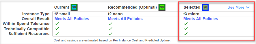 Meets All Policies | Score ≥ 50 and Cost ≤ the selected Spend Tolerance. | The best option, with the highest score is shown in green and other good options are shown in lighter shades of green. Cost is the on-demand price * Uptime % |