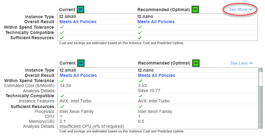 A summary table showing details of the current and recommended (optimal) instance type is displayed below the catalog map. Click the “See More” link to see additional details for both instances.Figure: Catalog Map Summary Table - View Details