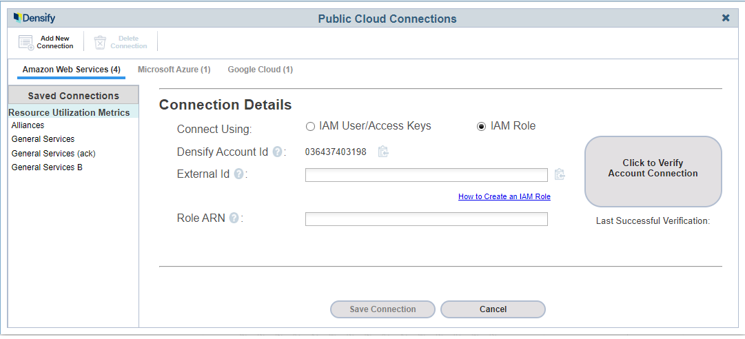 - IAM Role—An IAM cross-account role that establishes a trust relationship between AWS accounts. In order to create the connection you need the prerequisite information, including the external ID and Role ARN. See: