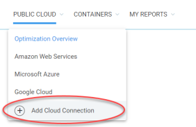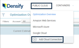 Once you have collected data and are using the Densify Console you will not see the Densify landing page. You can still access the Cloud Connections wizard from the Public Cloud > Add Cloud Connection menu.Figure: Accessing the Public Cloud Connections Wizard
