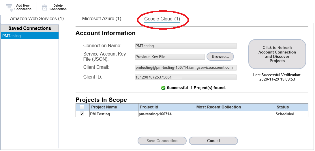 - If you want to re-discover and update projects associated with the current service account JSON file, click the Click to Refresh Account Connection and Discover Projects button.