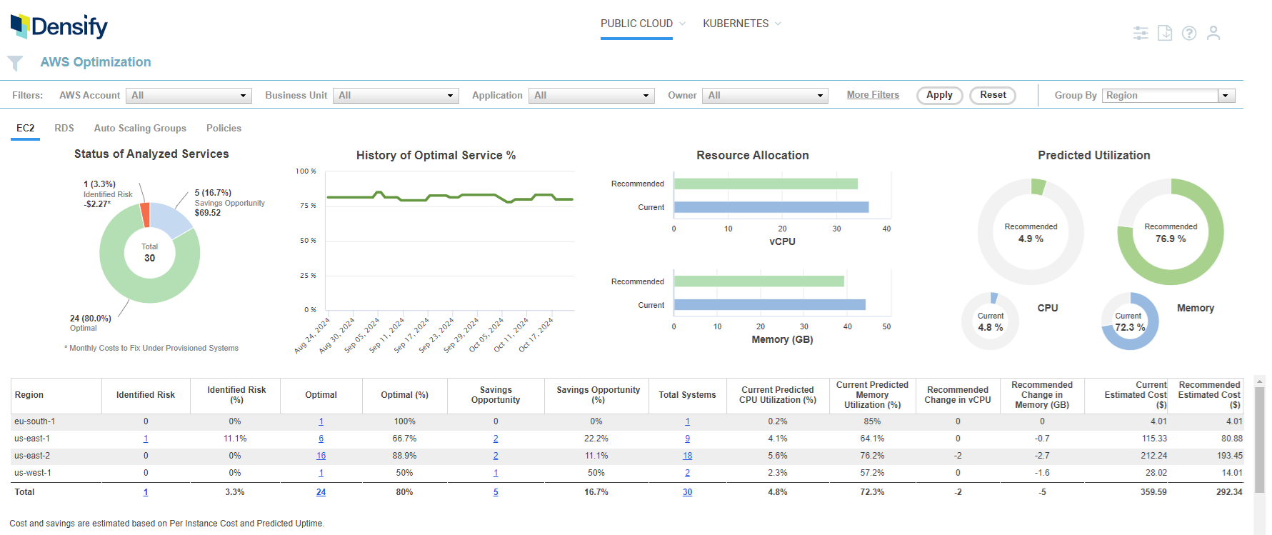 Savings Opportunity (%) | This column contains the number of over-sized instances as a percentage of the total number of instances that are running the selected application, or are associated with the defined grouping tag/attribute. |