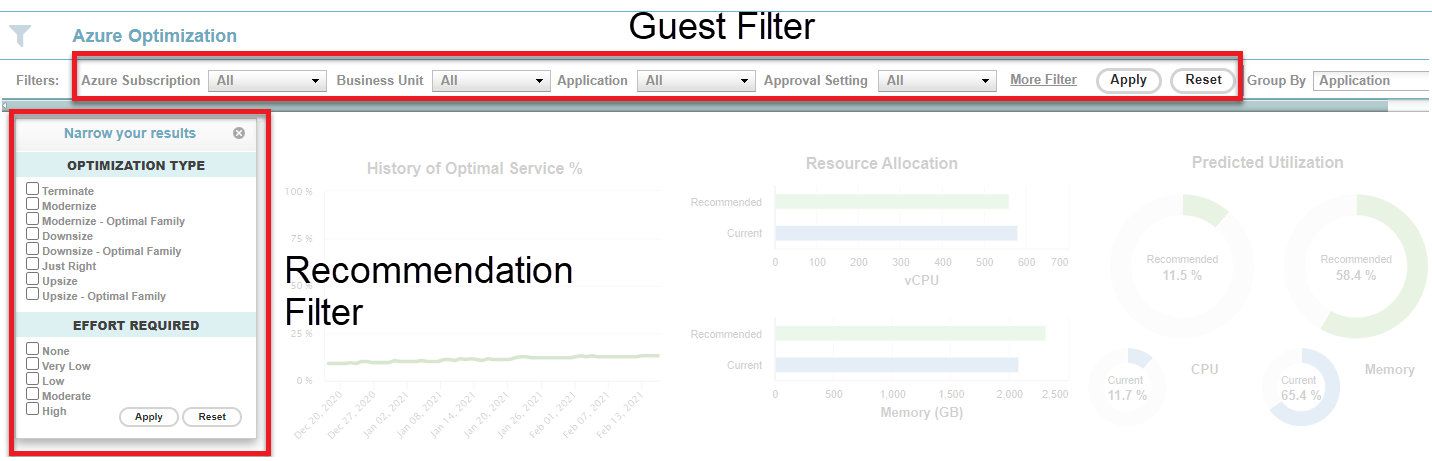 You can filter instances using a set of attributes (e.g. Business Unit, Application). This type of filtering is supported on the optimization opportunities dashboard tabs, as well as the Instance Optimization Details page when navigating from the Count column. The guest filters selected are persistent across platforms for those pages that support the guest filters (i.e. guest filters selected for AWS EC2 will apply to the AWS RDS, AWS Spot Instances, as well as the AWS Instance Optimization Details reports). For details, see Using the Guest Filter.Grouping Data by Instance Attributes