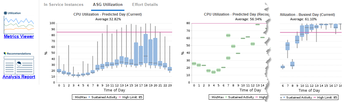 - In Service Instances—Shows workload charts for current and recommended predicted scaling activities for the selected ASG. For ASGs identified as “Just Right” or “Terminate” (optimization type), only the current in-service auto scaling activity chart is displayed.