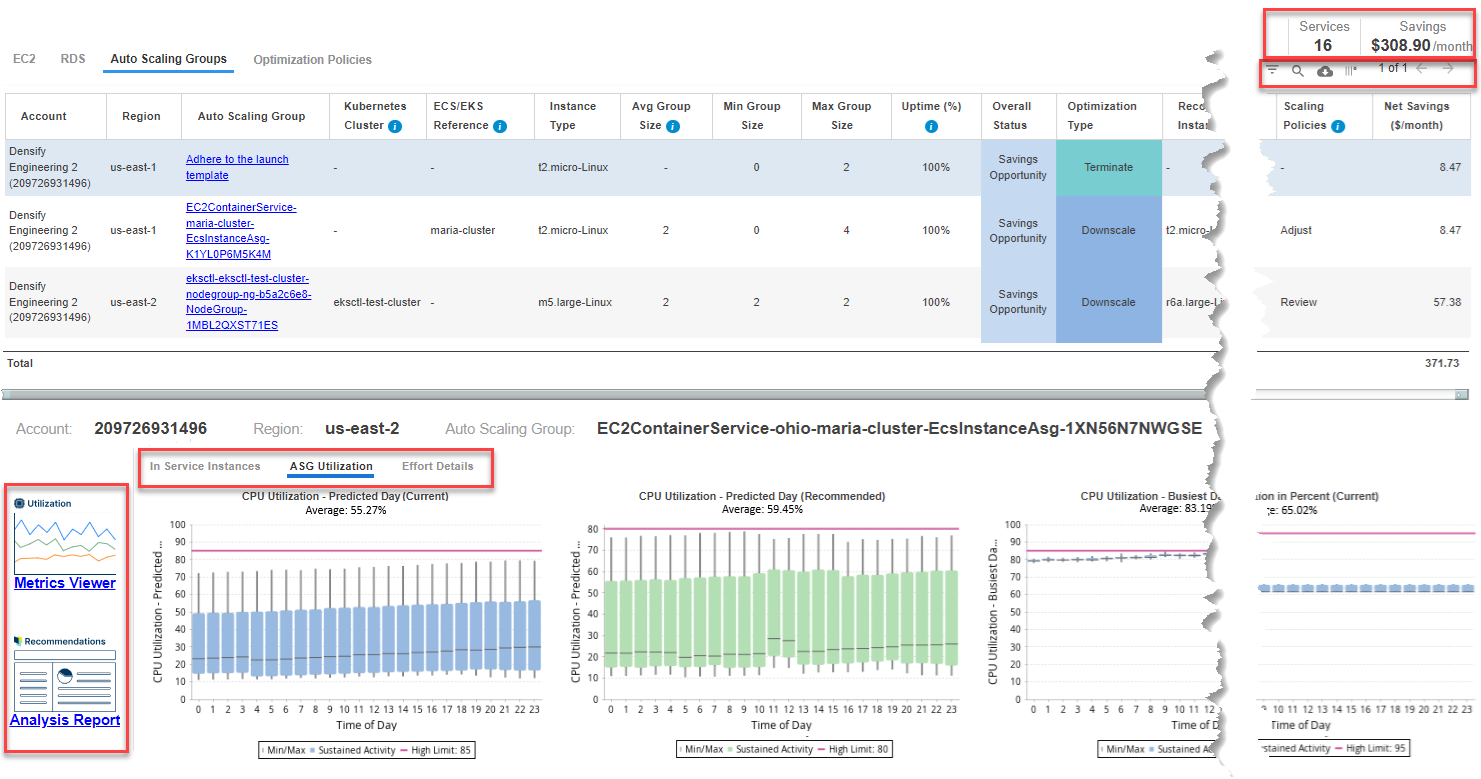 - Tabs in the lower pane display the selected ASG’s predicted scaling activity and resource utilization details. A third tab shows the effort required to implement the recommendations.