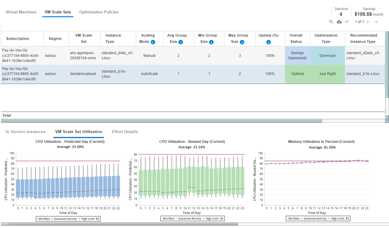 The bottom pane of the VM Scale Set report provides the following information for the row, selected in the tabular report:- In Service Instances—Shows workload charts for current and recommended predicted scaling activities for the selected VM Scale Set. For VM Scale Sets identified with optimization type=“Just Right” or “Terminate”, only the current in-service scaling activity chart is displayed.