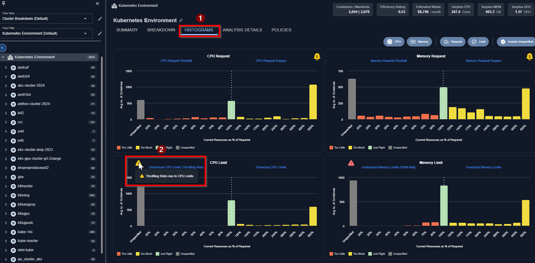 - The CPU Throttling risks due to undersized CPU Limits are highlighted in the Histogram.