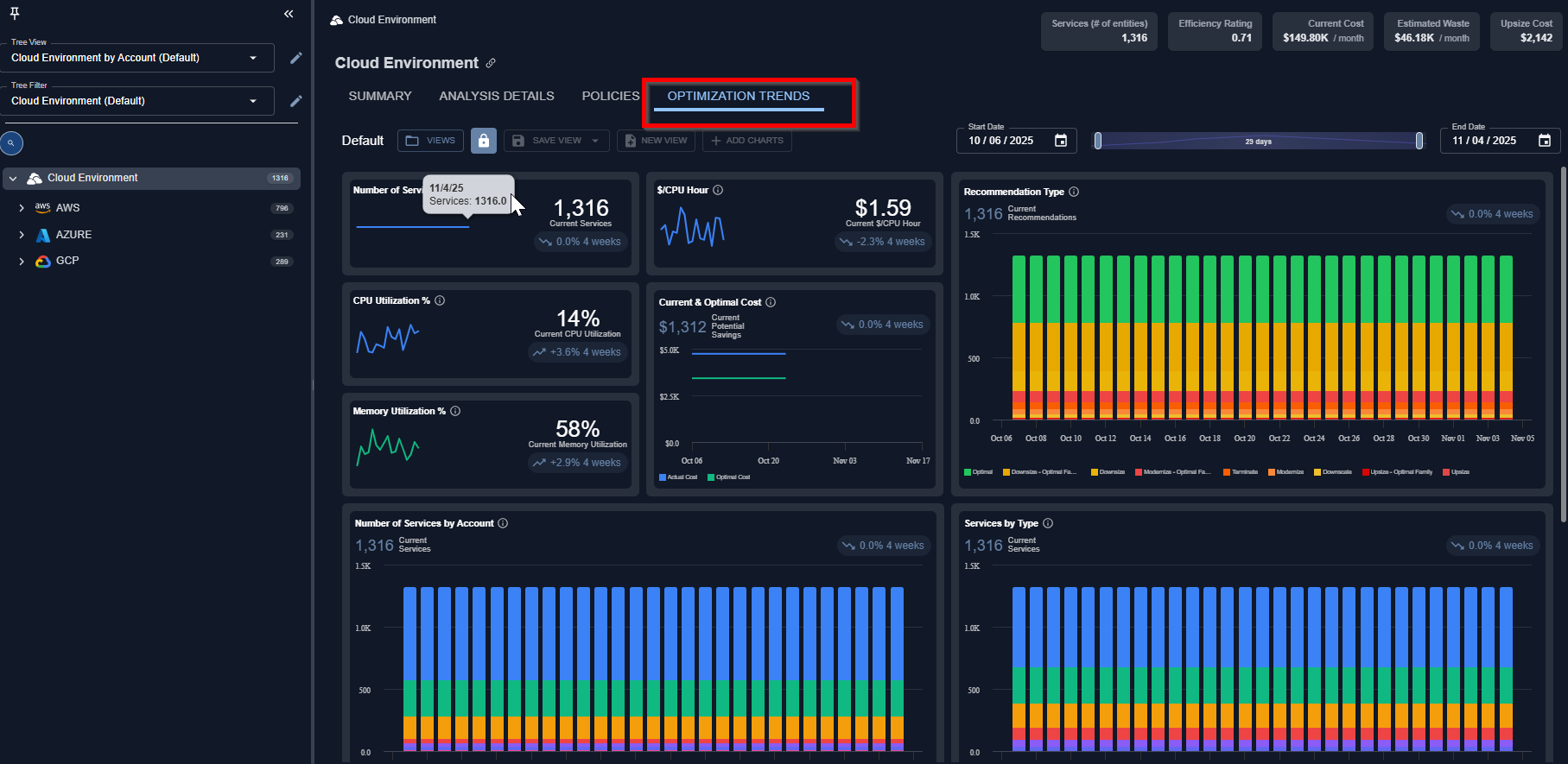 - The Optimization Trends reports visualize historical trends across key operational metrics, including instance counts, costs, savings, and CPU/Memory utilization. This helps users better understand performance patterns and optimization impact over time.
