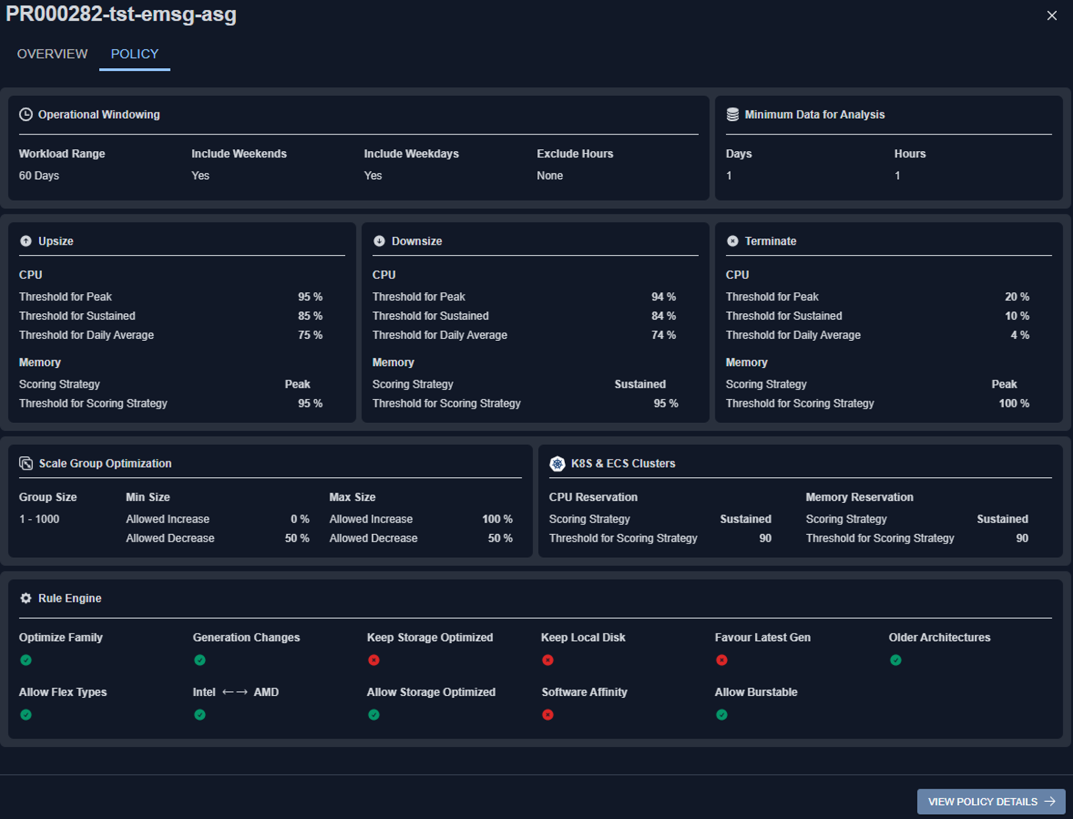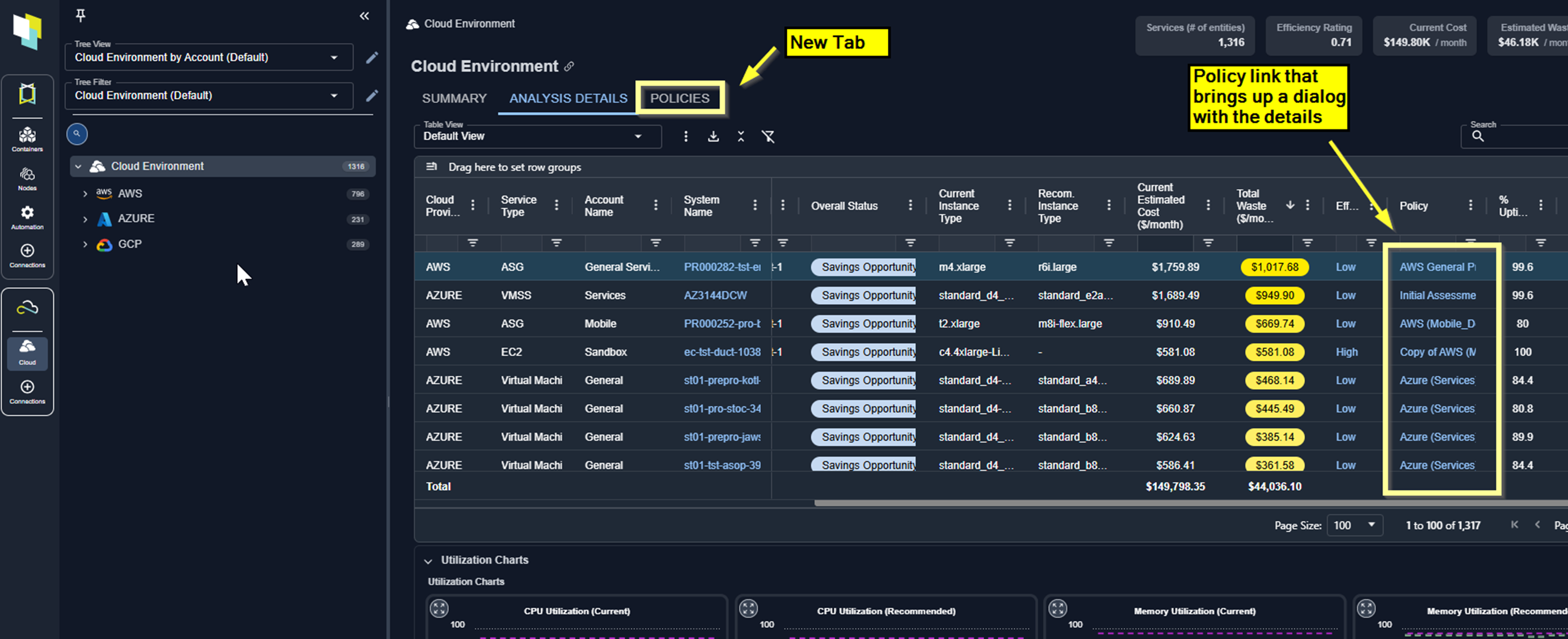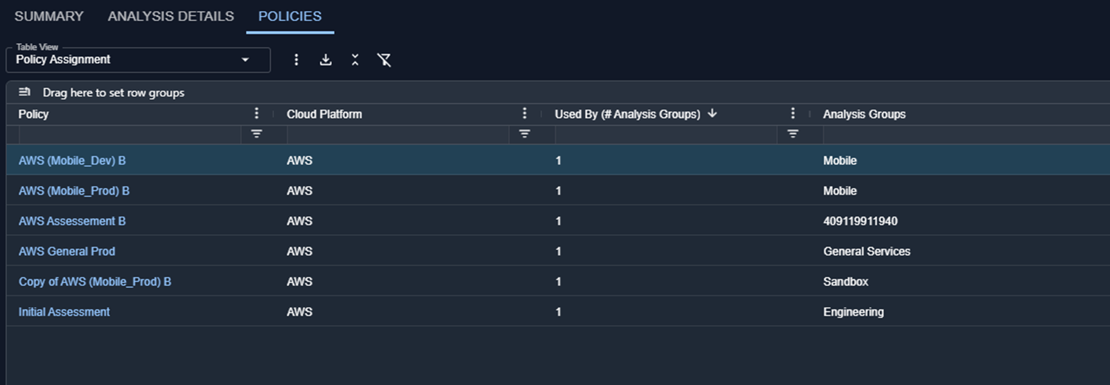 - Policies—View policies for Cloud environments in a new modal, accessible from the Policies tab and Analysis Details table.