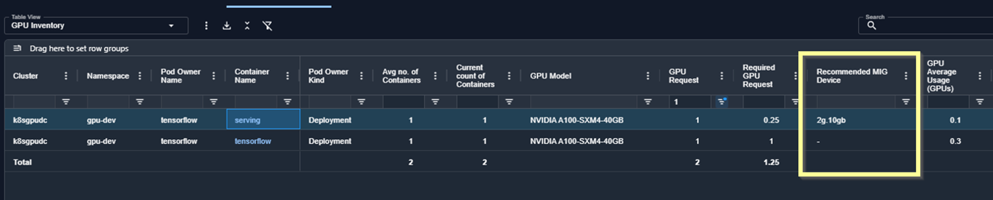 - MIG recommendation info is also available in the GPU tab for an individual container manifest