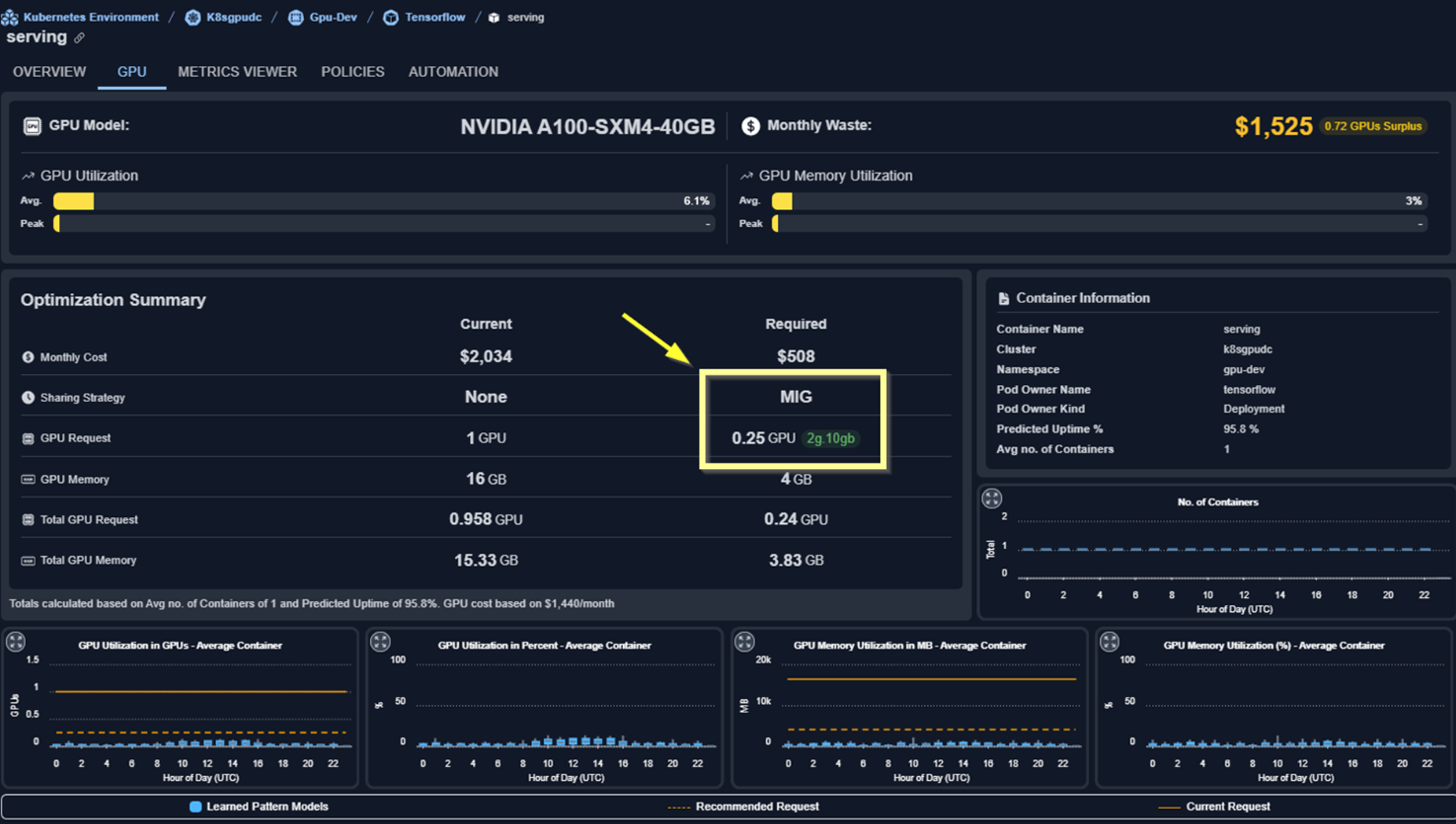 Figure: GPU Tab - Optimization Summary with MIG Recommendation