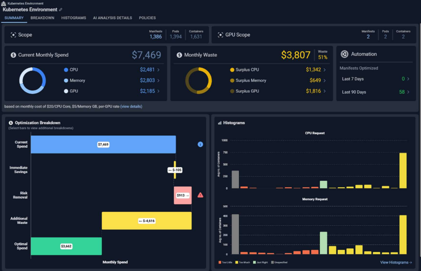 - Updated Summary—New GPU-specific cards have been added to the containers Summary page. A note includes a link that opens a modal containing GPU pricing details. The top two cards on the Summary page have also been updated to better highlight both your current spend and the details of possible savings.